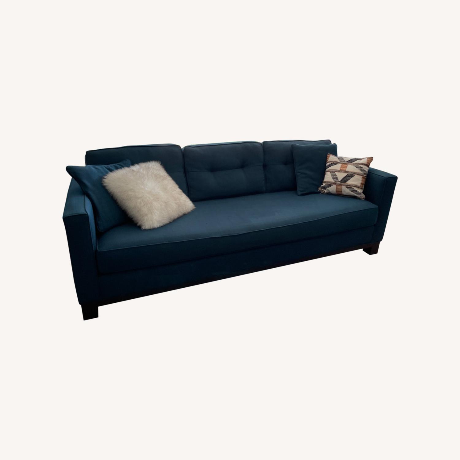 Seller's Notes:This is a custom couch made by The Joneses LA. They make high end furniture and stand by their product with a lifetime warranty, so this couch is still in great condition. We got lots of compliments on the color, which is a dark blue with a very slight turquoise tint, and you can see a couple of ways we decorated. The fabric is a textured weave with good stain resistance. Please contact me with any questions! MEASUREMENTS: 96” across, including armrests 36” width 31” height of sofa without cushions. This is also height of armrest. 34” height of sofa with cushions 19-20” Height of seat 24” seat depth with cushions, 29” without