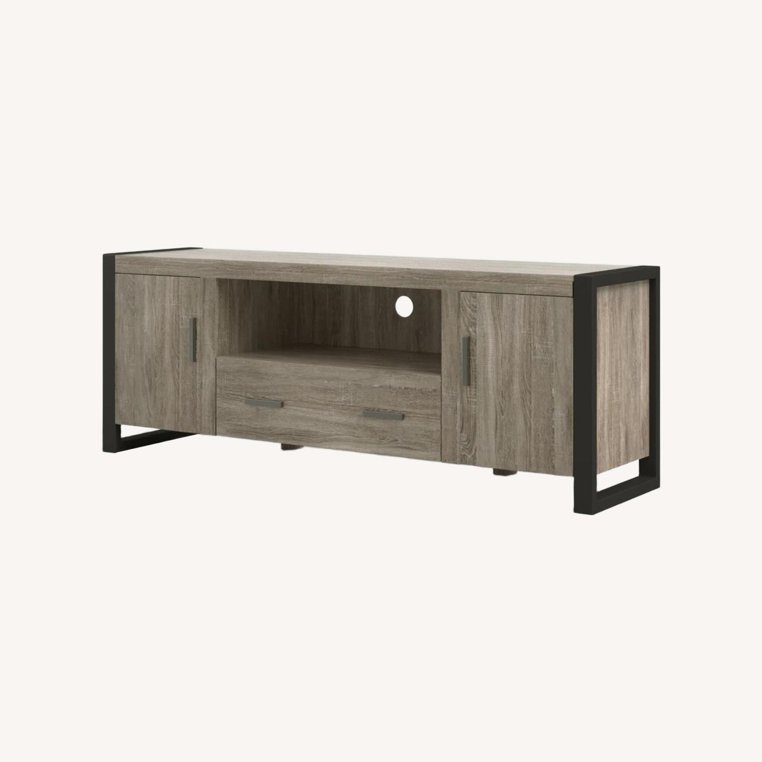 This TV stand features a mixed-material look and clean lines that infuse your living room with a modern feel we love. The frame is made from engineered wood with a weathered finish, and it's built on black metal legs with an open sled design. This stand includes an exterior shelf to display your cable box or gaming console, plus a drawer and two cabinets for tucking away board games and media essentials. Safety stops on the drawer keep fingers from getting pinched. Plus, it includes a sound bar shelf and a cable management cutout to help keep everything in its place.