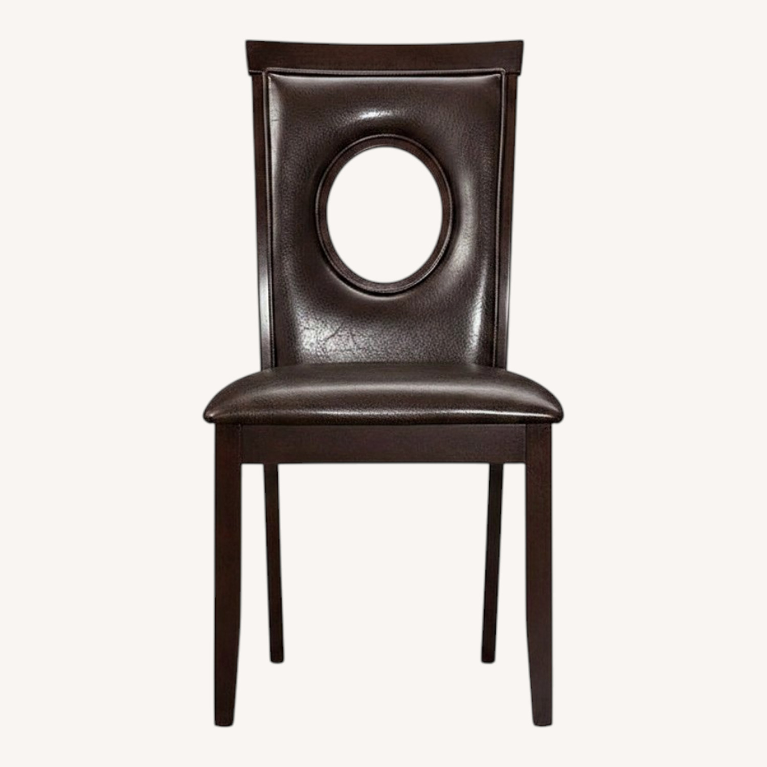 Seller's Notes:The Stapleton Side Chair by Coaster Furniture features Asian hardwoods and Agathis veneers in cappuccino finish. Upholstered in a dark brown leatherette, the chair has a bold oval cut out in the seat back for a contemporary style statement.