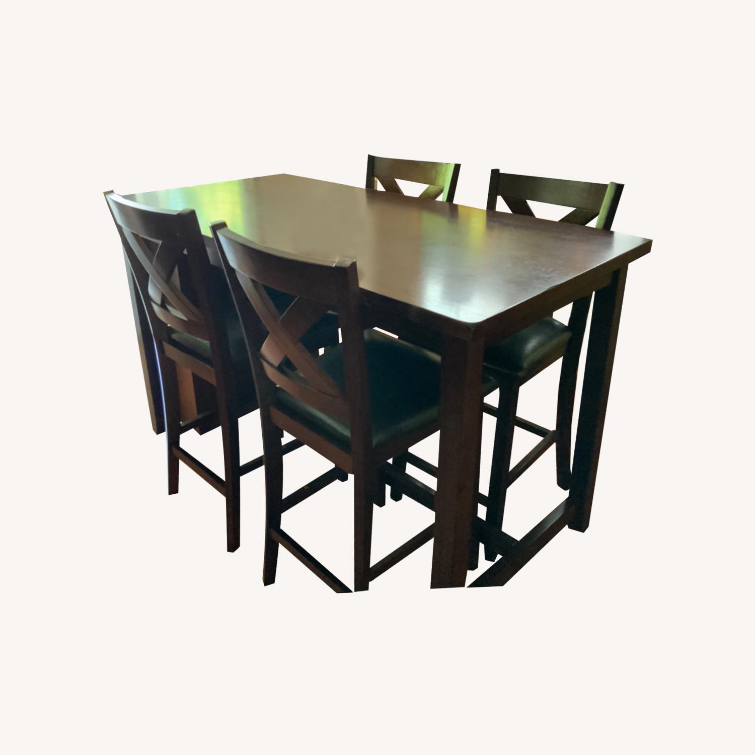 Seller's Notes:We've enjoyed this beautiful mahogany colored wood table and bar stool, high-top chairs for a little more than a year. It's a beautiful set with bonus bookcase in one end. While four chairs seat comfortably around the table, we added two for use at our island seating. We've downsized to a smaller space and want to utilize a round antique dining table to accomodate the dining space. It's a sturdy, gently-used piece looking for a new home.