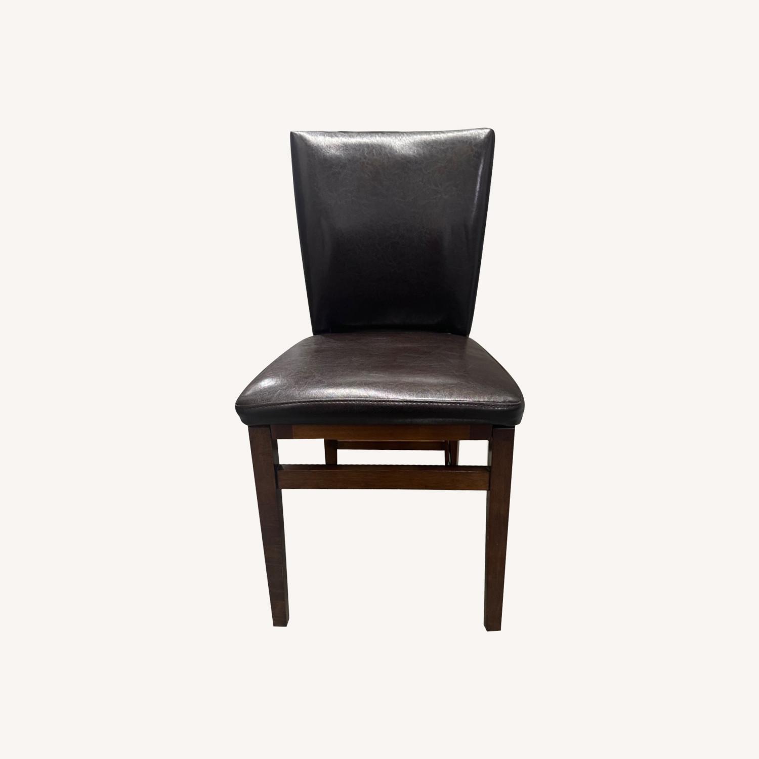 Seller's Notes:Sold as a set of 2. Multiple sets available. Lightly used in office setting. These faux leather chairs combines classic style with modern flair, enhancing any room. Comfortable and attractive for dining, it can also double as a stylish accent chair in an entryway, bedroom or living room. Complemented by solid wood legs and option to fold.