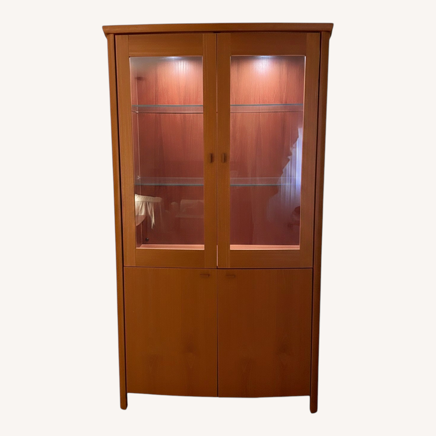 Seller's Notes:Teak Danish Modern hutch. Top has glass doors and two adjustable glass shelves, and two lights in the top. Bottom has solid doors with two adjustable shelves and two velvet-lined drawers, approximately 3 inches high. There are no scratches or other blemishes. This hutch is in almost new condition and has only been in one location, where it was placed when delivered from the store of purchase. China, crystal and other items display well in the top part of the hutch and the lighting adds drama. The bottom can be used for more storage, such as table cloths and napkins.