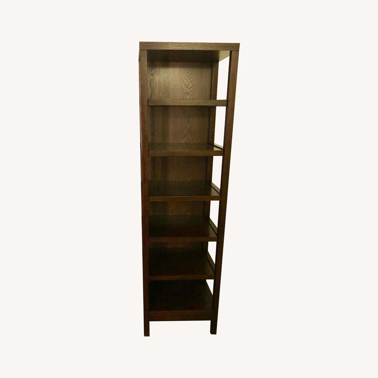 Seller's Notes:Great sturdy dark brown open bookshelves with adjustable shelves. Both bookshelves have remained in the same place since purchase and polished every week. 6' height, 2' wide, 16" deep. Space between each shelf as shown is 9.25" but can be adjusted to different heights.