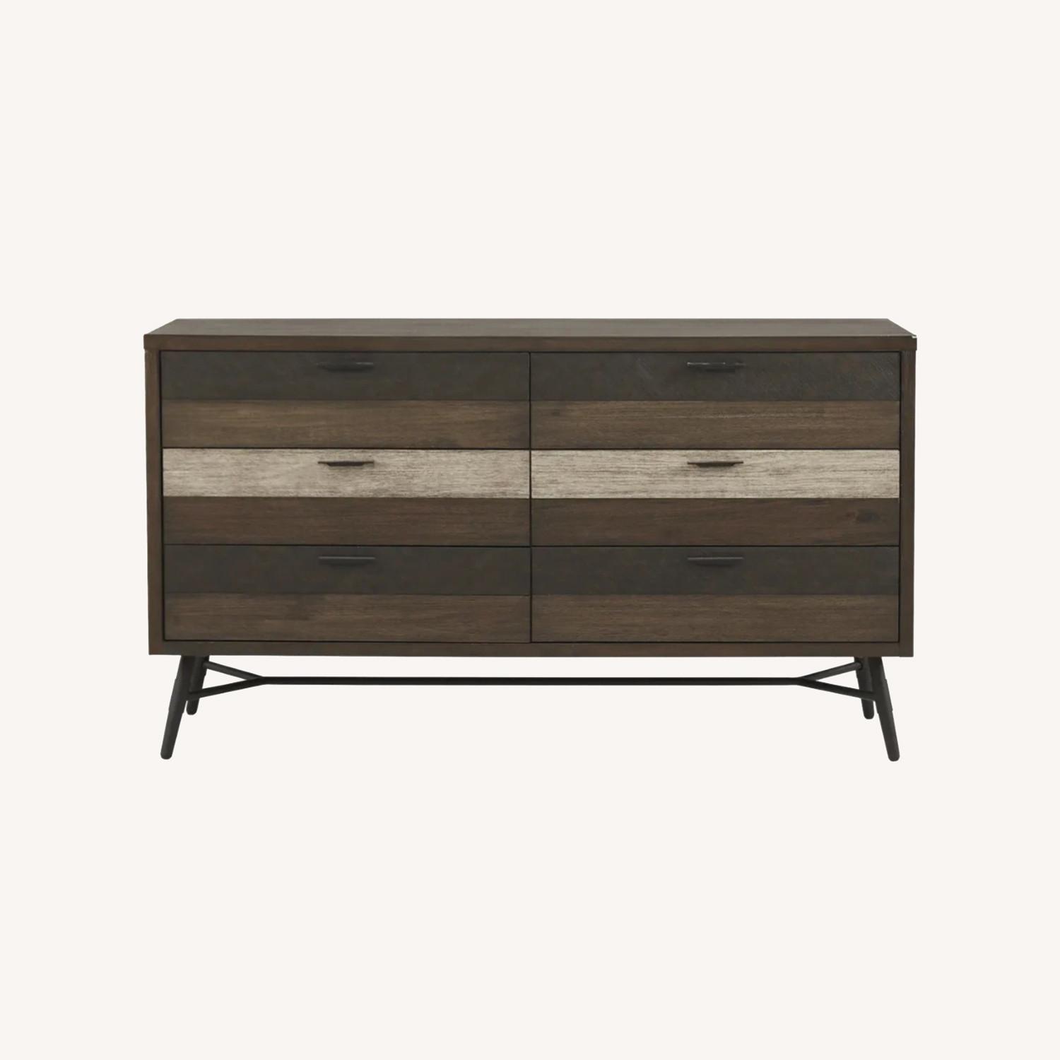Plentiful storage and mid-century modern style make the Midtown Loft dresser an excellent choice. This bedroom essential features six spacious drawers made with English dovetail joints for strength and stability. A variety of acacia veneer patterns add interest to the front of each drawer. Industrial-inspired black hardware and angled legs make a striking contrast to the brushed multi-colored dark brown finish. The dresser is made with high quality acacia wood.