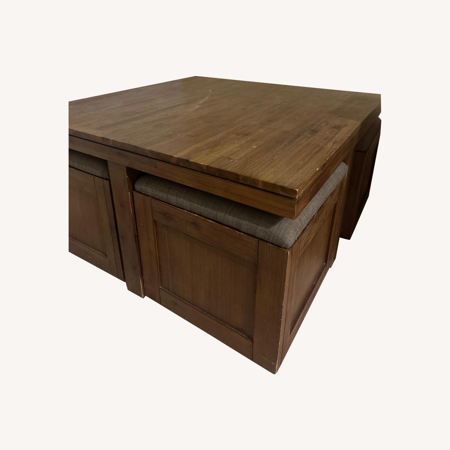 Seller's Notes:This coffee table has 4 stools that can seat 4 adults, each with their own storage under the removable seat.
