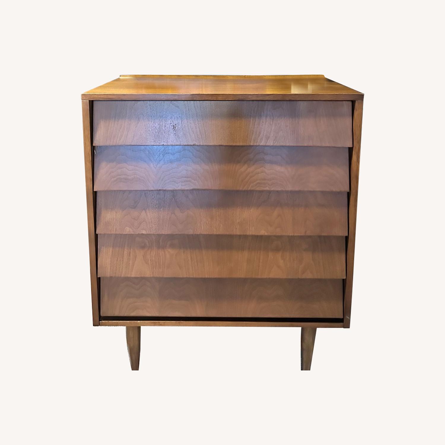 Seller's Notes: Gorgeous Ward MCM dresser featuring clean architectural lines, smooth oversized drawer fronts, and classic tapered legs. This piece has been refinished to highlight the warm walnut-tone grain and give it a sleek, modern look while preserving its authentic mid-century style. * Authentic Ward Mid-Century Modern design * Beautifully refinished wood throughout * Five smooth, spacious drawers * Solid, sturdy construction * Perfect as a bedroom dresser, entryway statement piece, or stylish storage Hard to find a Ward MCM piece in this condition—timeless, functional, and ready for its next home. Dimensions: Height: 41 Depth: 18 Width: 34