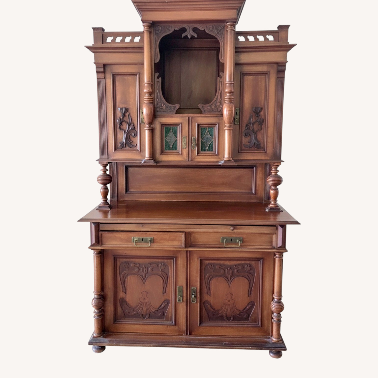 Seller's Notes:Antique China cabinet. In good shape. Left bottom hinge needs repair. Screw came loose. Missing a small piece of molding on corner of drawer but not very noticeable. In great neck, NY.