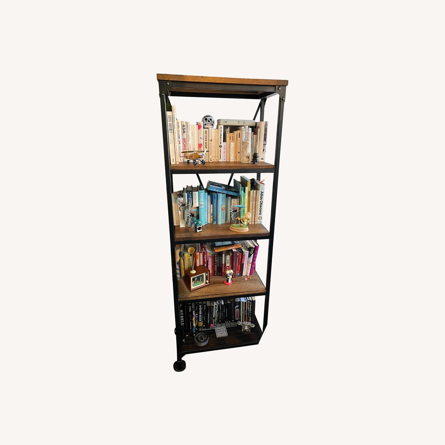 Seller's Notes:5-level dark brown wood and black metal book shelf. It stands on stationary wheels (style choice, they don't move/there's no movement with them). Very sturdy for tons of books and / or plants. Only getting rid of it because we need space for a desk!