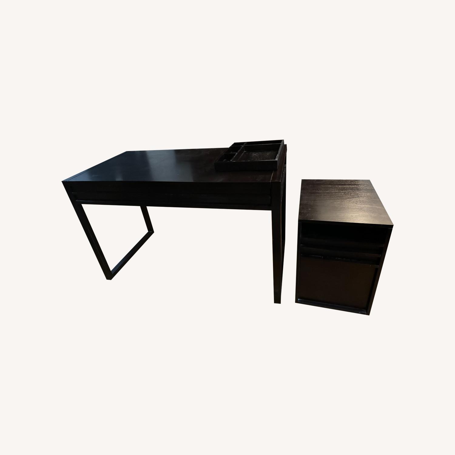 Seller's Notes:This beautiful & functional writing desk is in fantastic condition considering its age. Drawers work perfectly and barely a blemish across any surface. The desk & file cabinet both have drawers, and the desk comes with an organizer that fits perfectly inside either the desk or file cabinet drawer. It's a dark chocolate brown finish with a nice shine. The desk is 31" H x 50" W x 25" D, the file cabinet is 23.5" H x 13.25" W x 20" D. I've had this piece for years but am switching to a standing desk, so need to find it a new home. I hope you enjoy it!