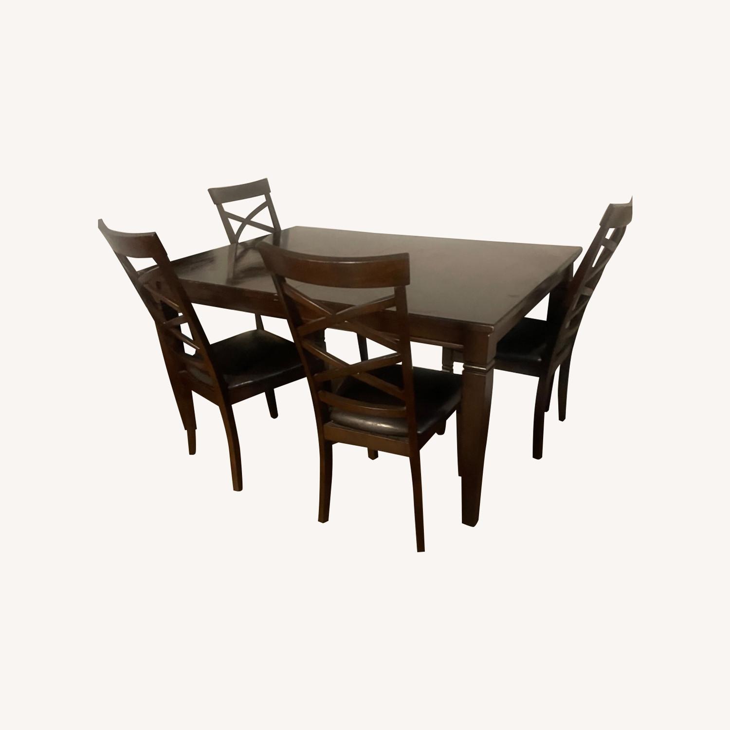 Seller's Notes:6 piece dining room set. Beautiful dark cherry wood. Home is smoke free. Pet free. Set comes with wood table and 4 chairs and extra extender piece for extension.