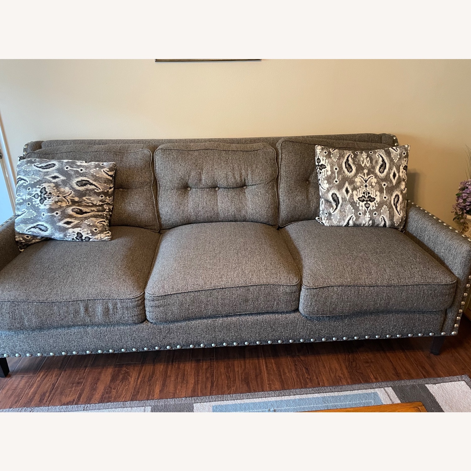 Seller's Notes:Nice gray tweed fabric sofa. Back cushions are attached. Lower cushions are separate and more on the firm side. Very comfortable deep seating.