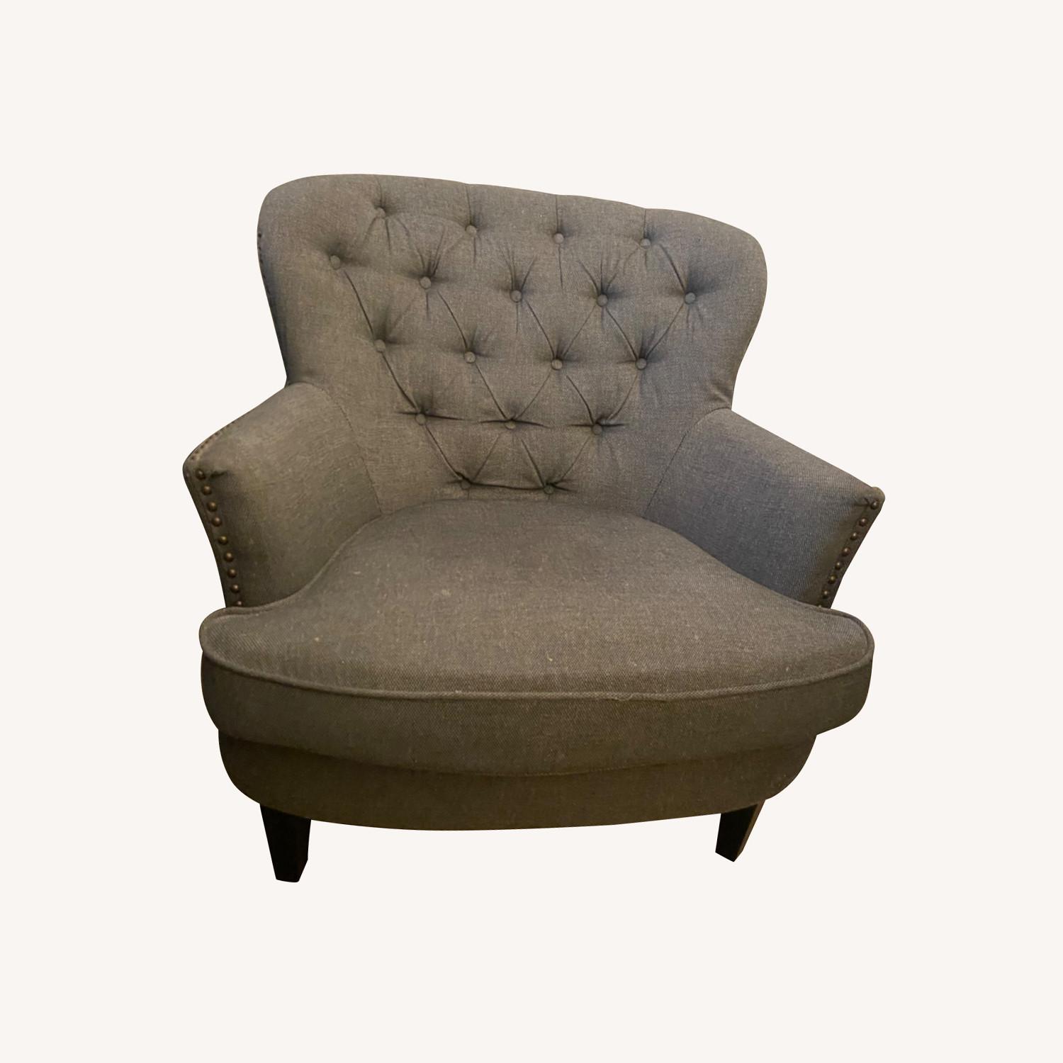 Seller's Notes:This arm chair has served me well and still has plenty of life to live - gray tweed material, brass tufting, and matching ottoman makes the perfect arm chair for your living room or study.
