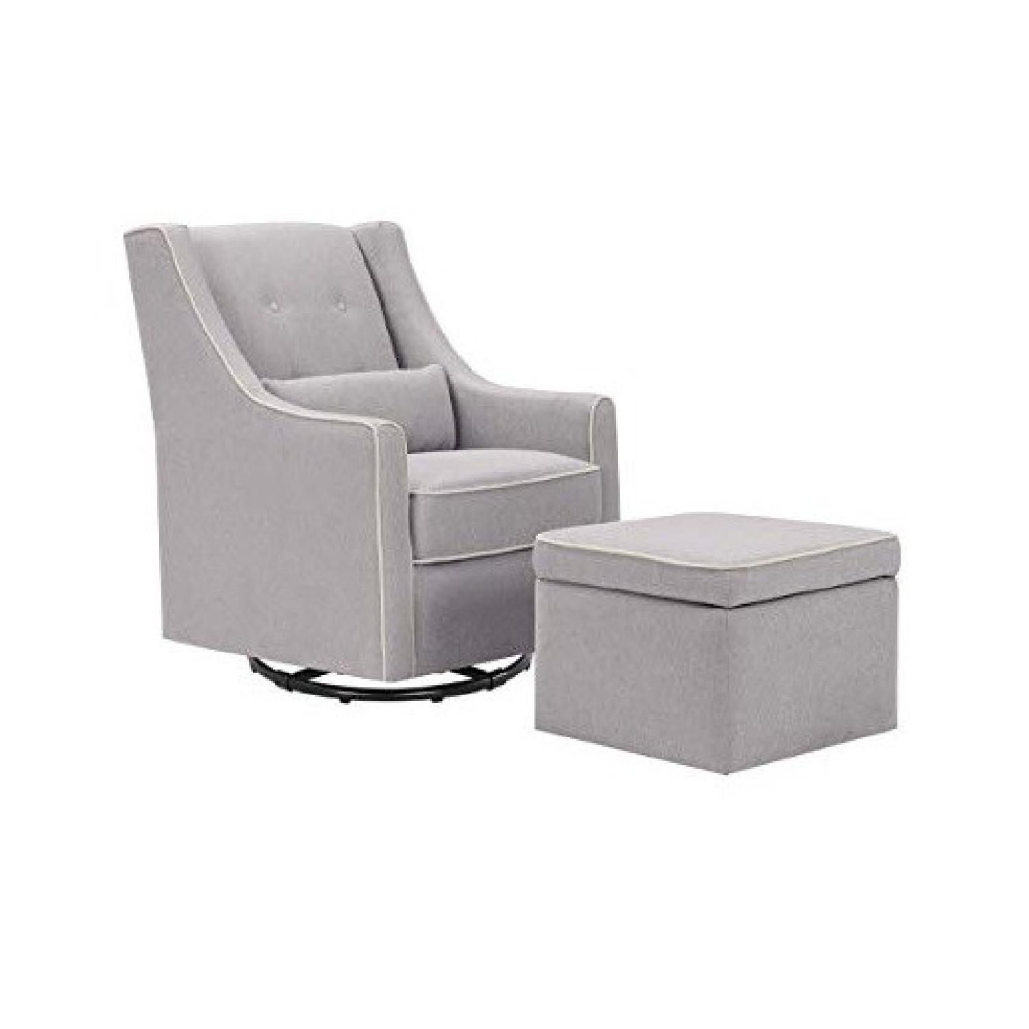 Collection: DaVinci Olive Upholstered Swivel Glider and Ottoman in Grey with Cream Piping