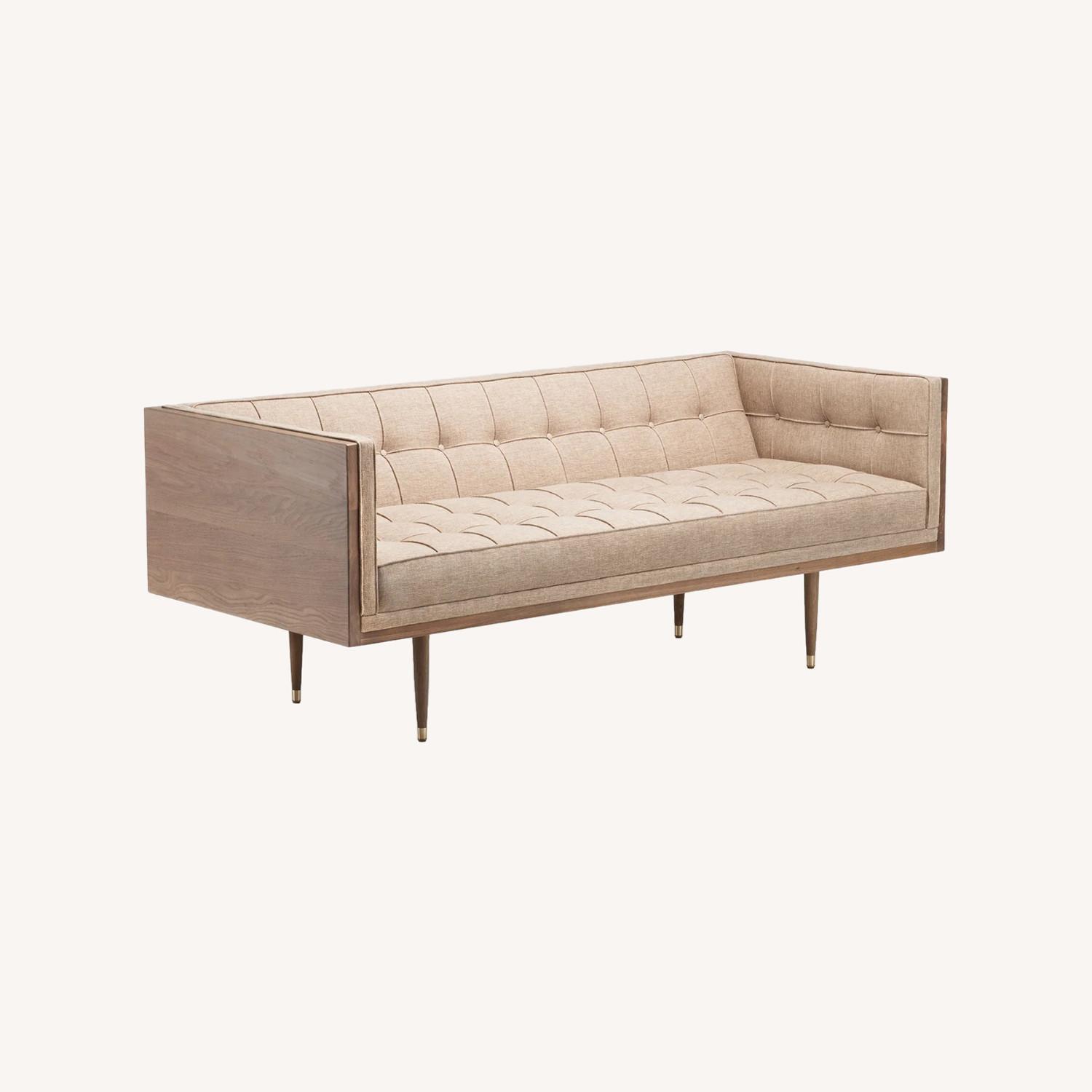 Box Sofa, inspired by the 1950s' modernist movement, has the pure shape of a box. The inner face of the solid wood form offers refined comfort with crisp upholstery and classic tuft detailing. The four supporting legs appear to be impossibly slender, creating a stunning profile.