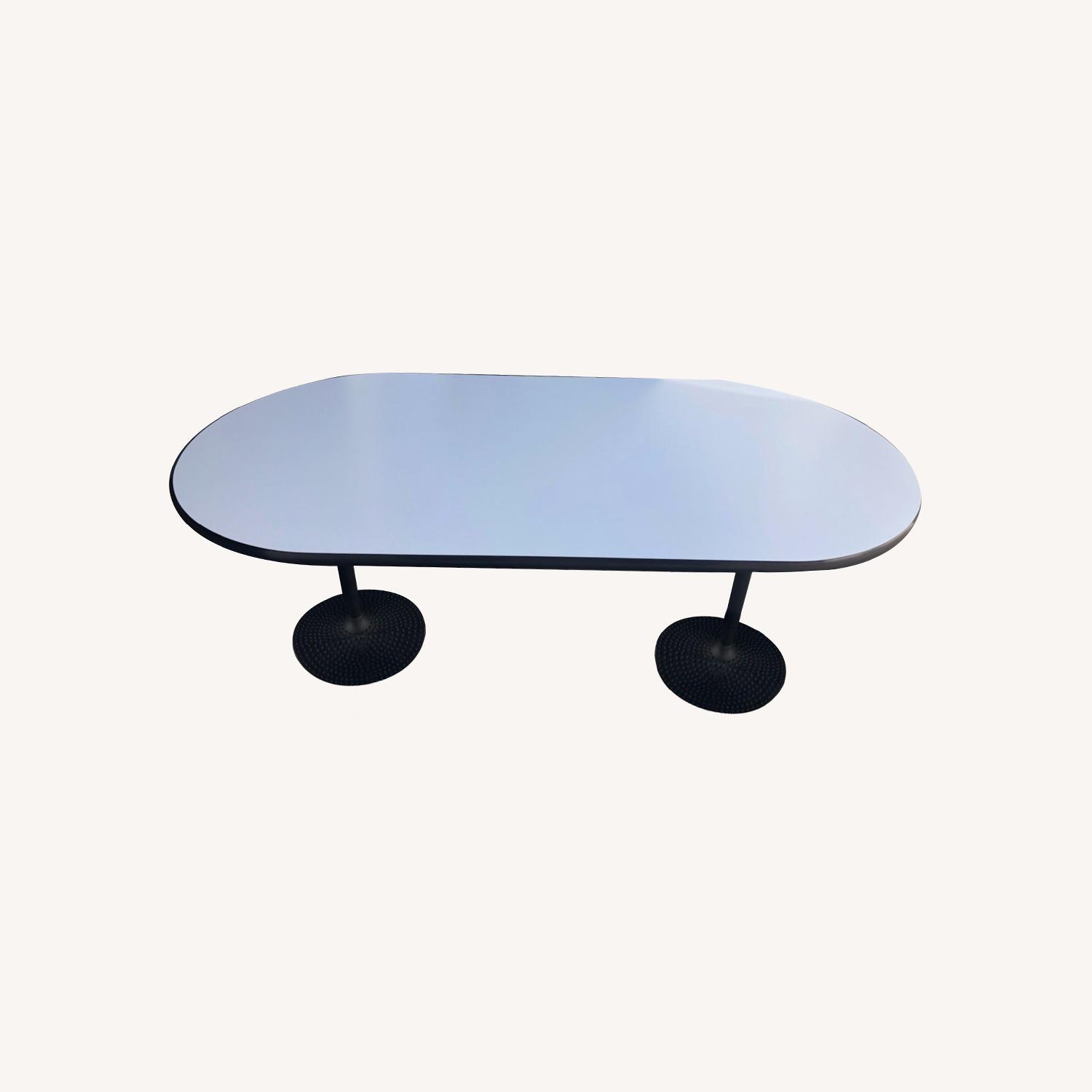 Seller's Notes:Mint condition Italian Designer (Bieffelplast) dining set. Laminated Table top is white, with lacquered steel base. Very well preserved. Six leather chairs. Designer name Stamped. Owned by a meticulously clean individual.