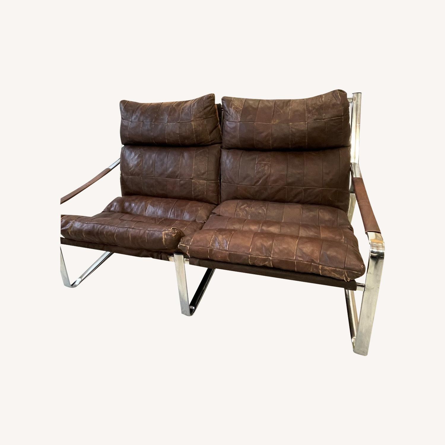 Seller's Notes:Danish vintage patchwork leather sofa with chrome frame -around 1970. Reminiscent of De Sede. Seat height is 17" size / dimensions: 29"X51.5"X31"