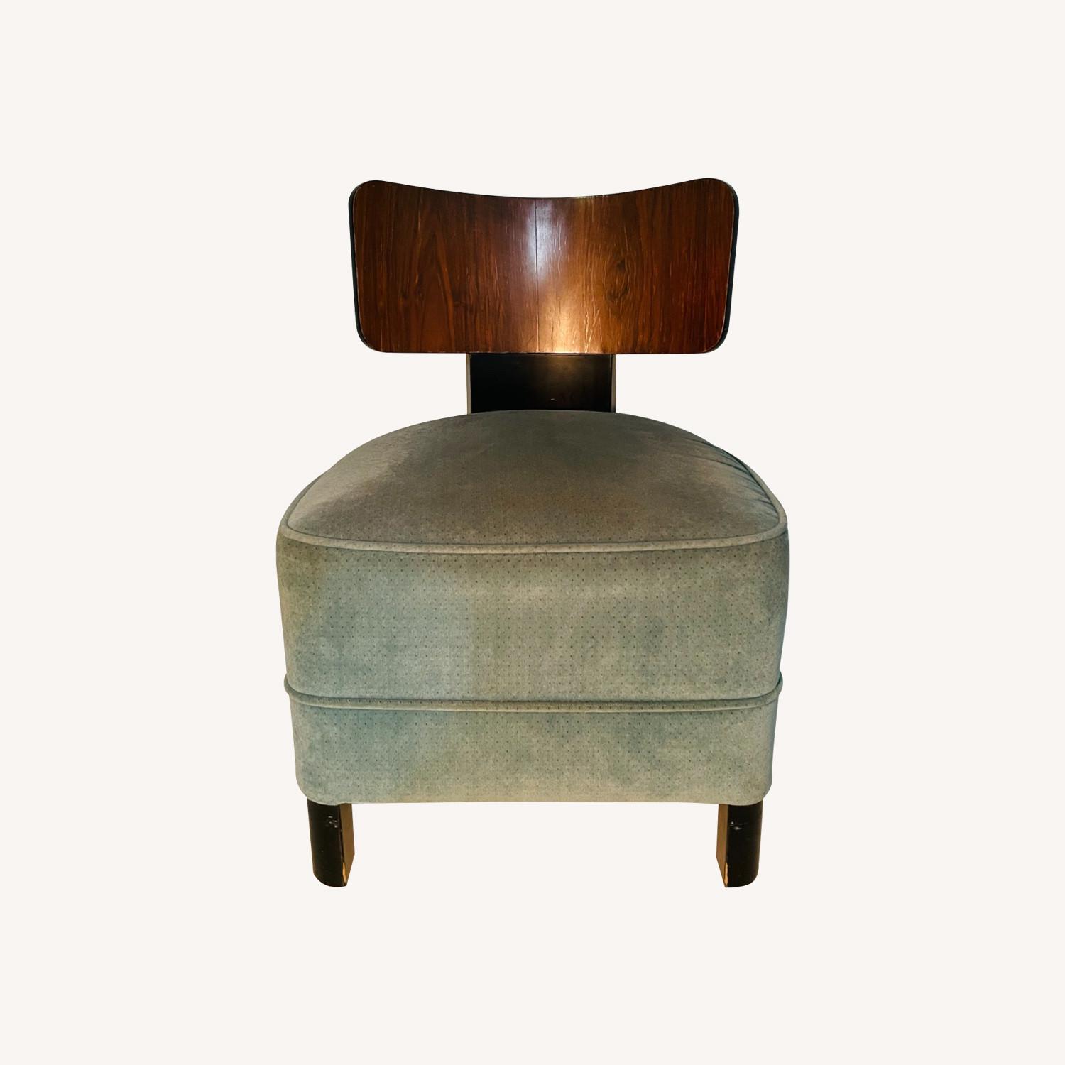 Seller's Notes:Deco-style chair for vanity or dressing table with three legs. Seat is low -- about 15 inches. Rounded seat back is walnut veneer -- with some cracking. Rest of wood is black lacquer, with some chips and scratches. We reupholstered the seat about 20 years ago in turquoise or light aqua velveteen fabric. This chair was purchased solo -- with no matching table -- in Los Angeles in the 1990s. Based on the style, we estimate that it is from the 1930s or 1940s, but we don't know. See the detail of the underside of the wide back leg to see how it was constructed from solid wood into a slight curve. It's a fun piece, but we are moving and won't have room for it in the new place!