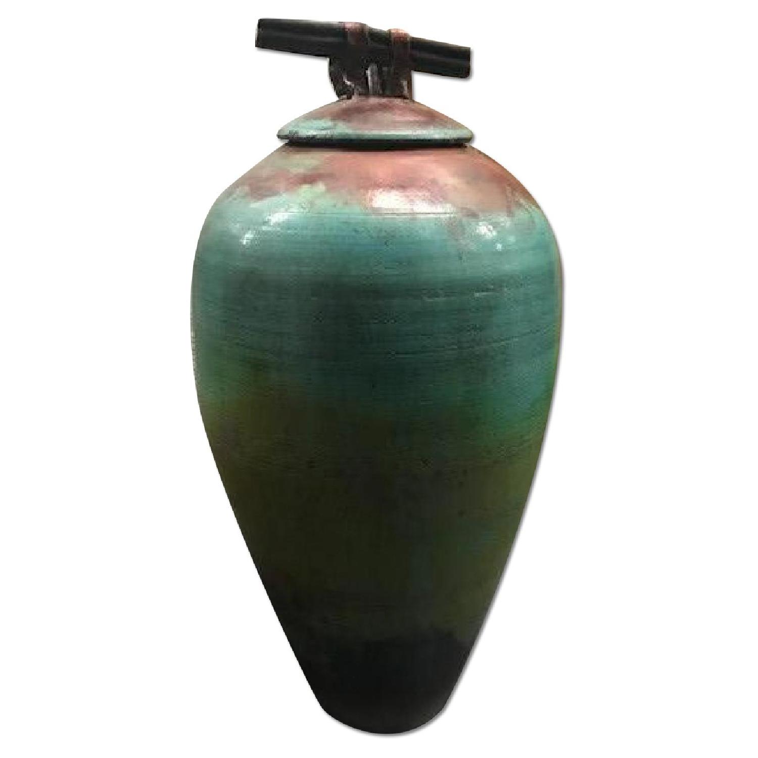 Seller's Notes:Beautiful multi-color vase with aged turquoise finish. Can be uses with or without the top, the top measured 4 inches. Colors different from every angle, truly beautiful one-of-a-kind piece!