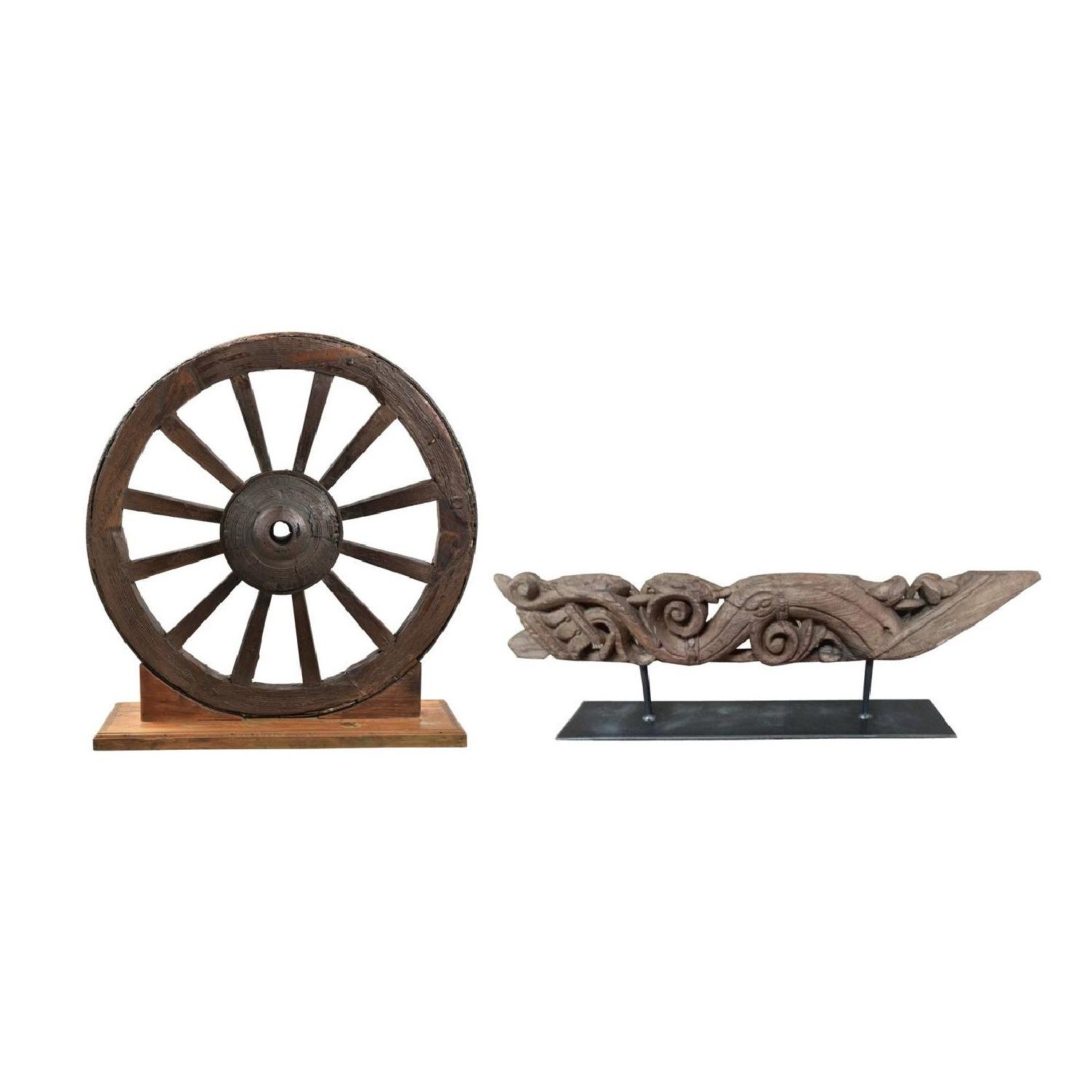 Seller's Notes:This Wooden Narju & Wheel Combo Set decor adds a unique flair to your space. Made from old wood, this table top decorative object features a beautifully intricate design with an antique natural look. This hand crafted piece makes a great decor for any urban or rustic look. Product Specifications: Dimension/ Weight: Narju-24" W X 4" D X 9" H/ 15.97 lbs Wheel-33" W X 12" D X 33" H/ 93.11 lbs Finish: Natural & Wax Finish Material: Old Wood Brand: Designe Gallerie