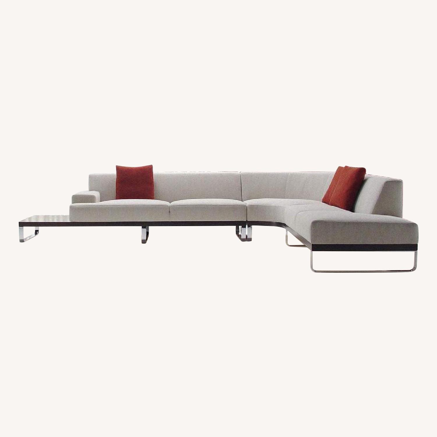 Seller's Notes:Purchased at Jensen Lewis. Silvery Gray. Goes with anything. It’s a great sofa! Modern clean lines. Has some wear from use, but still looks fantastic. 3 pieces. Right arm sofa chaise and curved corner. Stainless leg and wooded accent. 108”x108”.