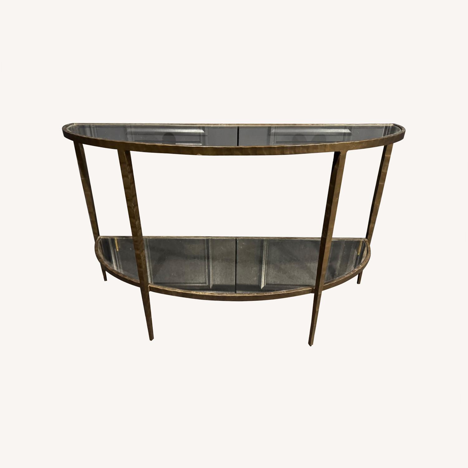 Seller's Notes:Beautiful metal (I believe iron) and glass demi lune console table with antiqued mirrored shelf (10.5โ high) I wish we could hold onto them but they no longer work in our space. There are a few scratches on the glass tops but not deep.