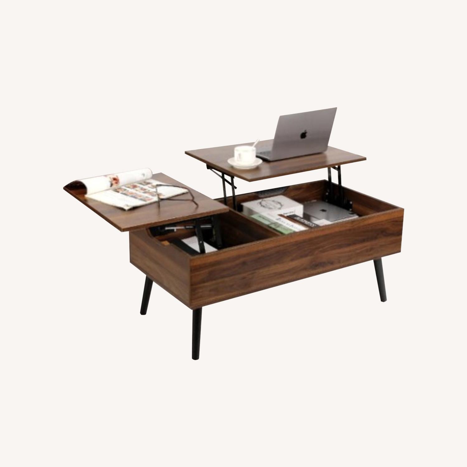 Seller's Notes:The open, geometric design on this clean-lined lift-top coffee table creates the perfect focal point for your home, adding a beautiful and unique design to your living room. This one-of-a-kind coffee table features a unique design that allows the split top to lift in two places and move forward to create two multipurpose workspaces, allowing you and your family to use the table separately without interruption. The tabletop can be easily adjusted to a suitable and comfortable height for you to work from home, browse online, or enjoy a delicious meal all while relaxing from the comfort of your loveseat. Beneath its handy lift-top surface is a hidden storage area that provides you with the perfect spot to stow away any around-home essentials you typically wouldn't want your guests to see.