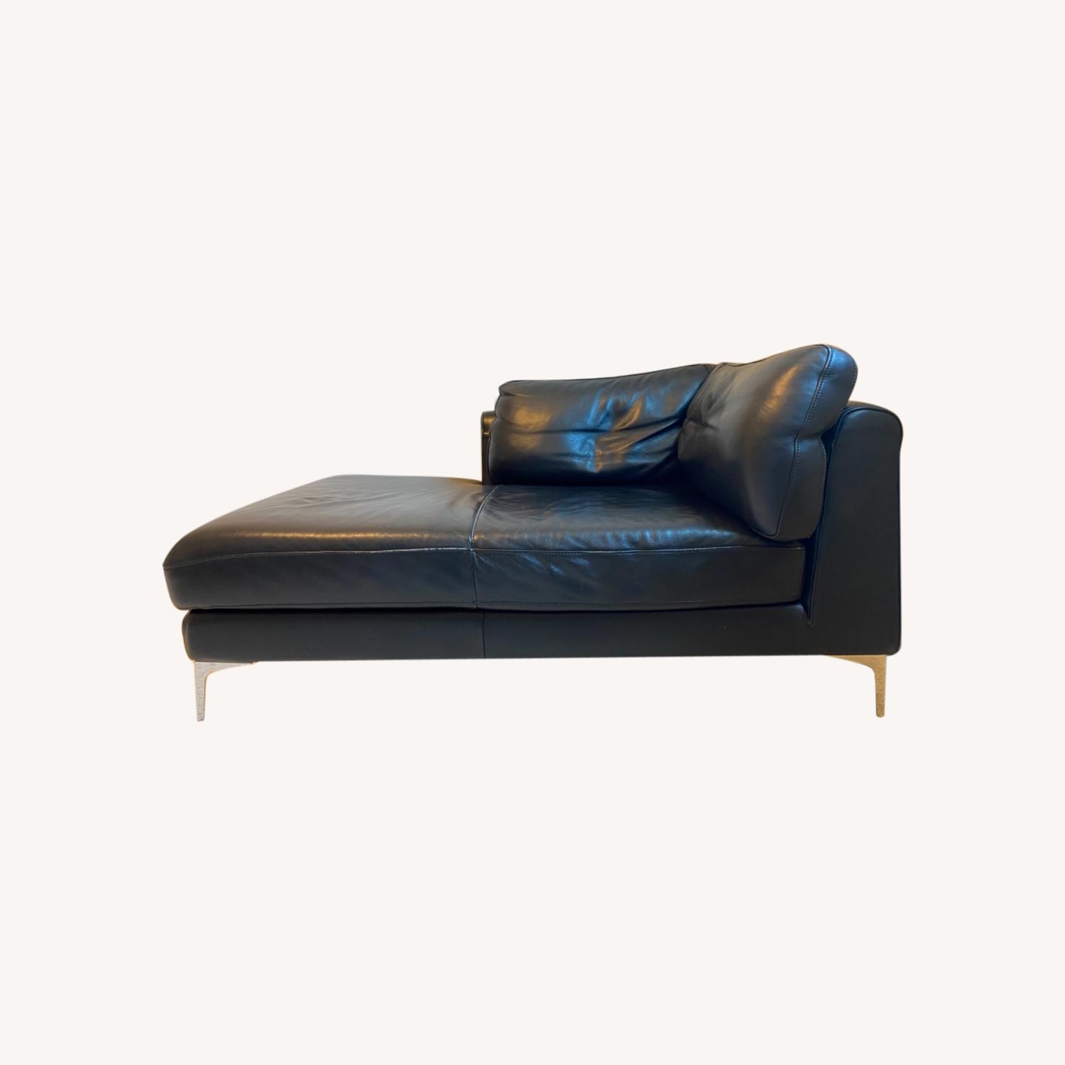 Seller's Notes:The chaise is upholstered in buttery black leather and sits on simple chrome legs. The chaise is on the left facing the sofa. The clean lines help to keep the sofa from appearing bulky. In fair condition with minor scratches on corners. -Seat Height: 17" -Seat Depth: 21" -Leg Height: 7" -Height: 34" -Width: 35" -Length: 62" New chaise was priced at $3000.
