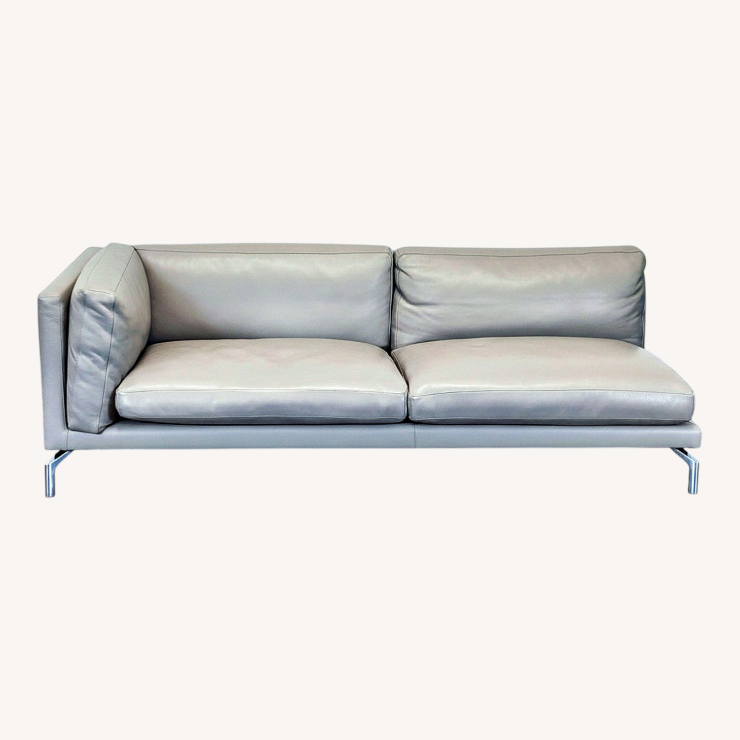 Seller's Notes:This Design Within Reach loveseat offers a sleek, modern look with soft grey leather upholstery and chrome legs. It features deep, comfortable cushions and a low-profile design, making it perfect for any living space. The loveseat is in great condition and provides style and comfort for your home.
