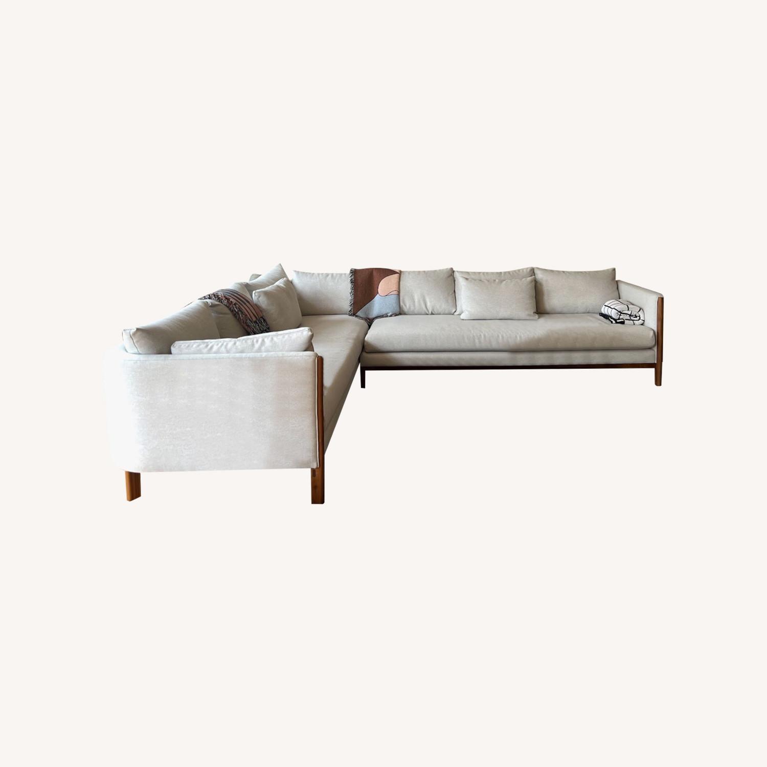 Seller's Notes:This was bought in 2022 and it took 1 year to arrive, but when it finally did, it brought our whole apartment together! This sectional has only seen 12 months of use. Dimensions (W×H×D) 121in × 31in × 97in This is the "Left" variant. Upholstery is "Shell". Base is "Walnut". About the upholstery: Made of 80% post-consumer recycled polyester, Maharam Mode combines luxury with sustainability: It offers the look of wool while saving energy and reducing waste. With a tactile, subtly contrasting weave, it appeals to both hand and eye. Plus, it boasts Greenguard and Greenguard Gold certifications, which means it helps minimize indoor air pollution. The only question is: What can’t Maharam Mode do? Relaxed but tailored appearance. Curved frame creates cozy corners to curl up in. Baffled back cushions with a feather-silk blend.