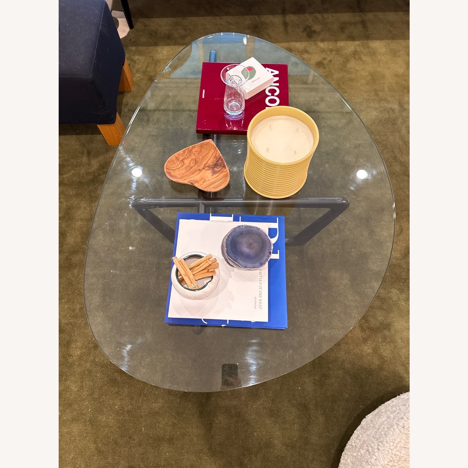 Seller's Notes:Design within reach glass coffee table with wood base. Purchased in 2019. Great condition. We love it but not baby learning to crawl friendly!