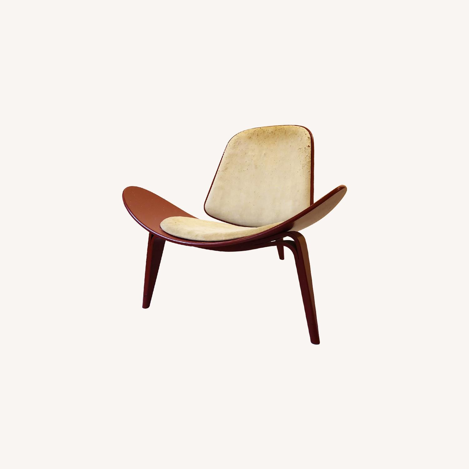 Seller's Notes:Originally designed by Hans Wegner in 1960 in Denmark this is a classic piece of Scandinavian Modernism entitled : CH07 Shell Chair. It is his orignal colors. The wood has a few scratches. Most of the damage is to the two upholstered discs which are easily removable with two set screws in the back and bottom. Replace this and you've got a classic for very little of the original cost.