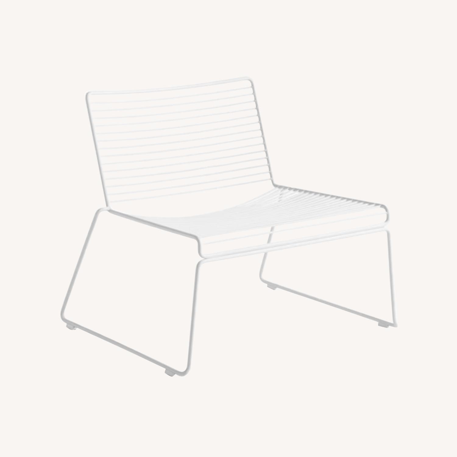 Inspired by an unlikely source – the wire shelves inside a refrigerator – designer Hee Welling created the Hee Collection (2004) for HAY. The durable powder-coated finish makes the Hee Lounge Chair suitable for indoor and outdoor use by protecting the solid steel underneath. It features a wide, welcoming seat and stacks for easy storage. Made in China.