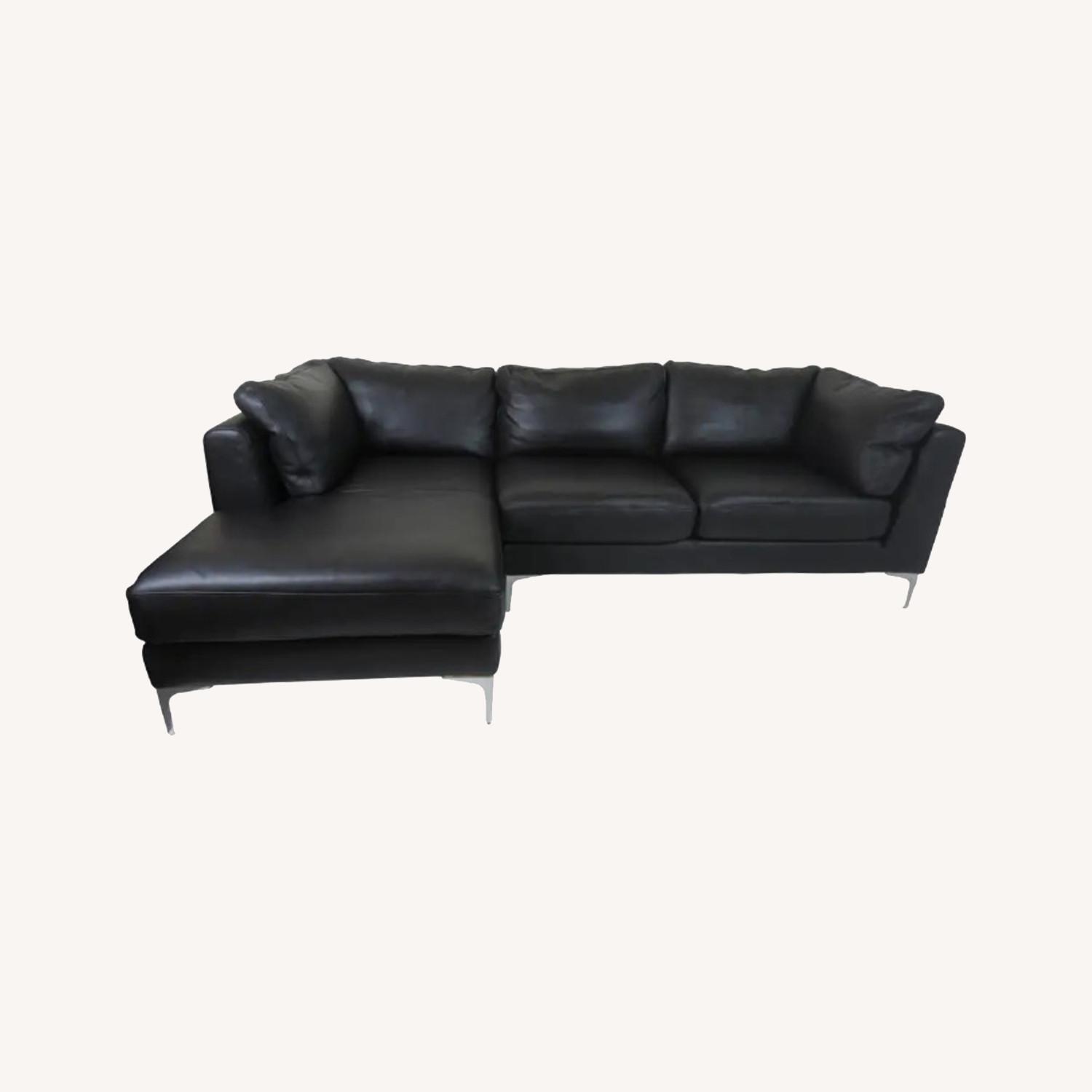 Seller's Notes:Two piece sectional from Design Within Reach, designed by Giuseppe Nicoletti, purchased 2005. Upholstered in luxurious Italian black leather. Incredibly deep seated and comfortable. The support cushions have velcro and zipper attachments, to keep them in place and upright. The legs are metal with chrome finish. The orientation of sectional is with chaise to the left side as depicted in room with patterned carpet. It is missing a peg which joins the pieces, but is still fuctionally attached. Dimensions: Sofa W 61 x D 34 x H 32 Chaise W 34 x D 61 x H 32 Arm height 26 Seat height 17.5 So hard to part with this beloved, well kept and important piece, but it doesn't fit the new space we just moved into.