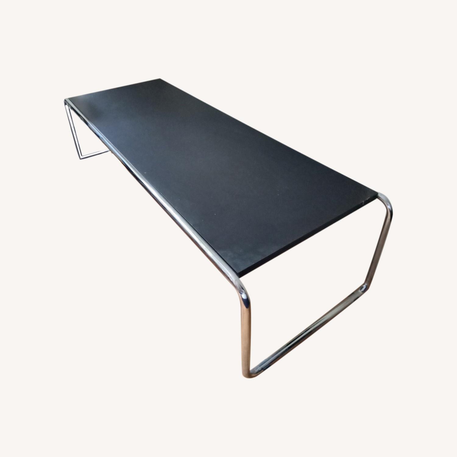 Seller's Notes:purred by Marcel Breuer's design of a low table to accompany the Wassily Chair, the very simple, very clever multipurpose Laccio Table (1924) exhibits his rationalist aesthetic and accomplished technique. The construction is extremely stable, with materials of exceptional quality. The cool beauty of the chromed seamless steel base and satin-finish lacquer top will not diminish with use or time. Each table has an individual number for identification and authenticity. Sleek table that can stand solo or be nested together in multiples. Plastic laminate top in satin finish. Seamless tubular polished chrome steel frame. KnollStudio logo and Marcel Breuer's signature stamped into the base. Laccio is a registered trademark of Knoll, Inc.