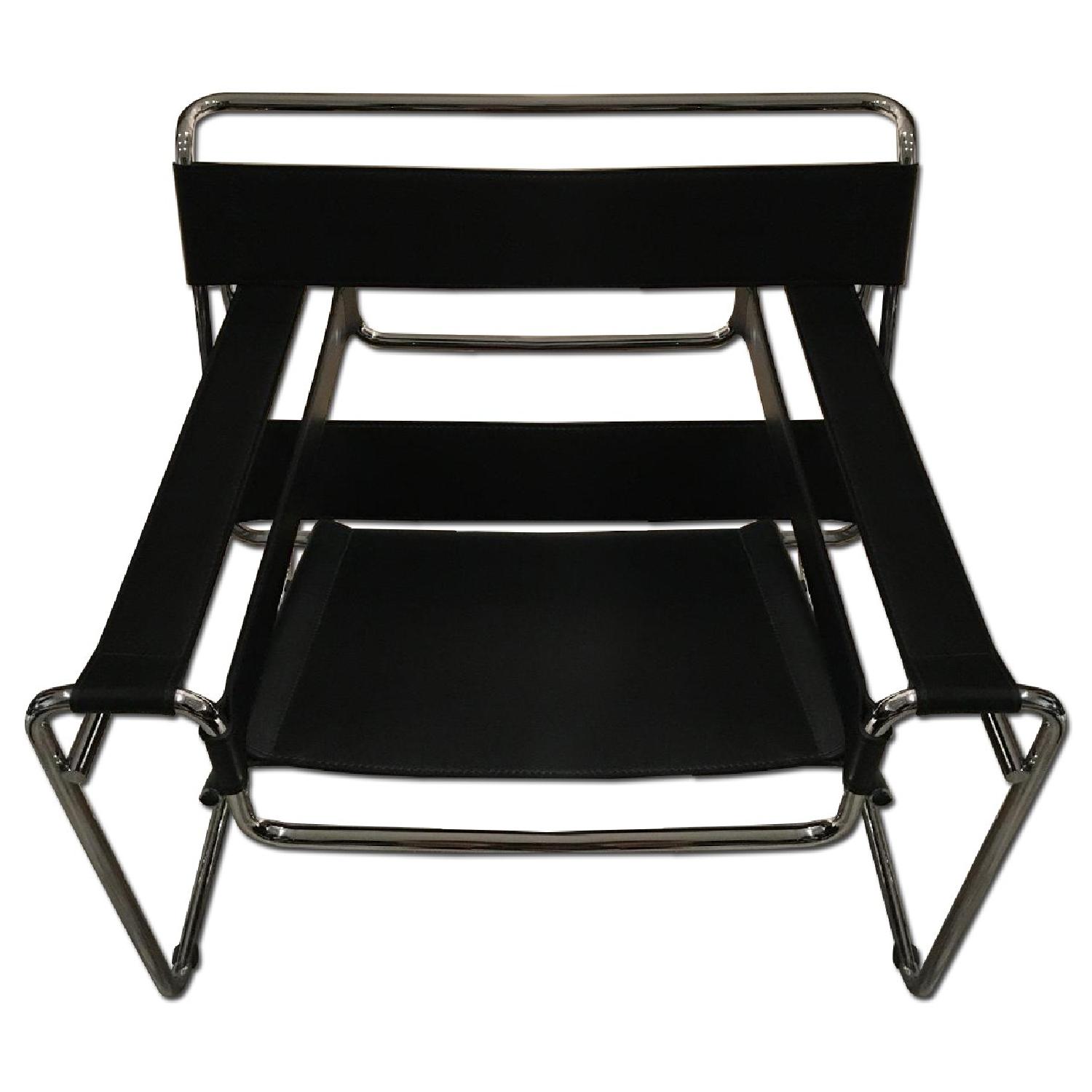 Seller's Notes:This beautiful pair of black leather Wassily chairs from DesignWithinReach was purchase and were used in a residential apartment for two years, prior to being wrapped up and placed in a temperature-controlled storage unit during my apartment renovation. The renovation work has now concluded, but I do not have space for the chairs. They are in good working condition - the polished chrome structure is as-new, and the leather strapping is also in good condition, with no warping or loss of shape. Wear and scratching from use appears on the seat of the pair of chairs, shown in the photographs attached, and no visible imperfections on the leather panels at the back or sides of the chairs. The leather panels remain tight - no visible warping or loss of shape. The chairs have been kept in temperature-controlled storage, with protection and regularly cleaned. No exposure to smoke or any temperature fluctuation. Material: tubular steel frame with polished chrome finish; black leather slings; plastic glides. 100% vegetable tanned, aniline dyed Spinneybeck® belting leather slings. Note: the chairs are available as a pair, or also as a single chair (price advertised here is for the pair; price available on request for a single chair).