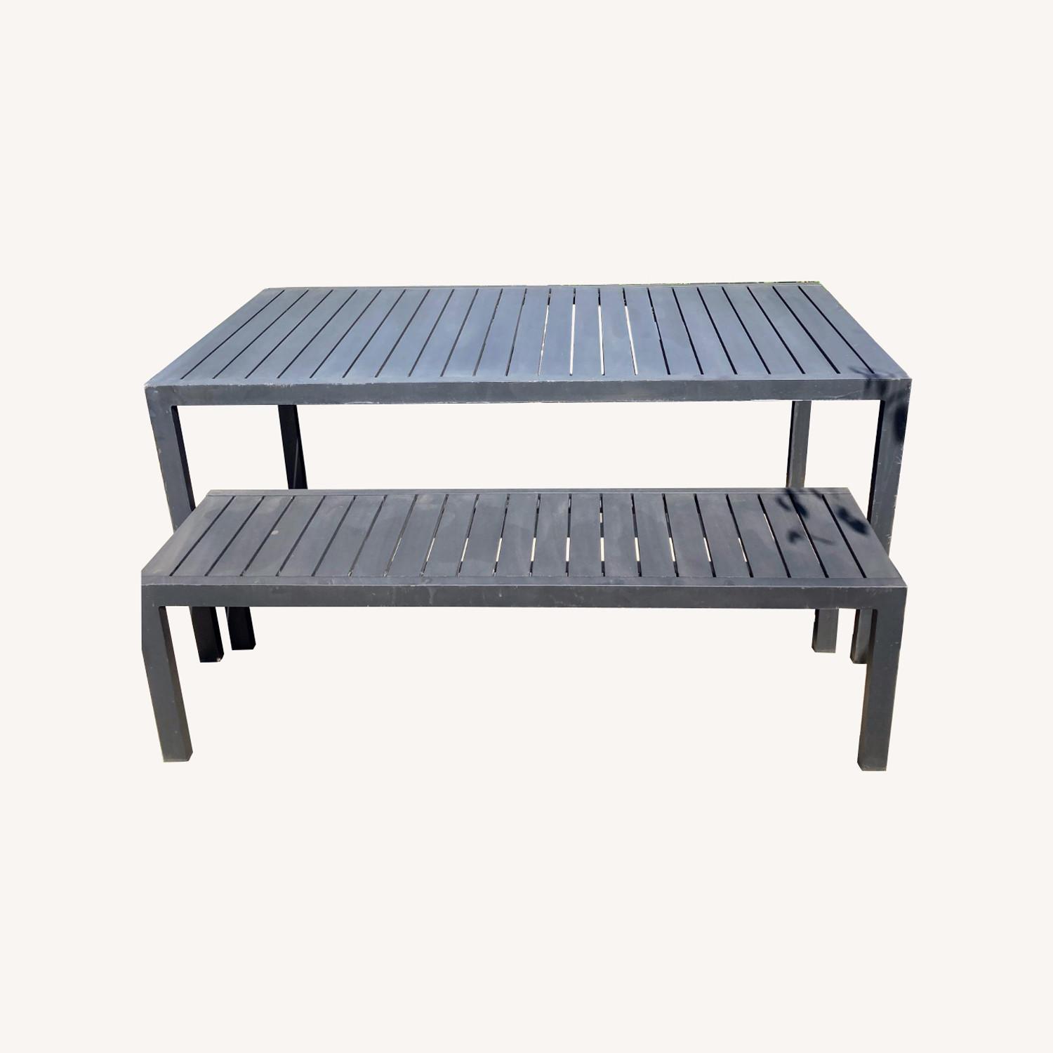 Seller's Notes:Selling my Eos black dining table and bench from Design Within Reach. Price reflects outside use and storage of the table. It's in excellent working condition, but it has scratches from being outside year-round. Dimensions TABLE: 64 length x 31 width x 29 height BENCH: 58 length x 16 width x 17 height The table is constructed of powder-coated aluminum. It's lightweight / easy to move. This is a larger version of the same table from the DWR website: https://www.dwr.com/outdoor-dining-tables/eos-communal-table/2198267.html?lang=en_US The larger table without a bench retails for $2995. The bench retails for $1295.