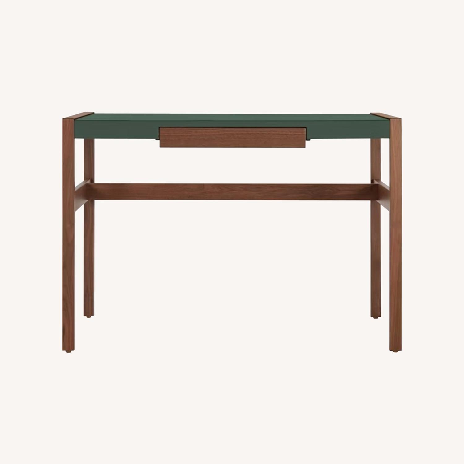 Seller's Notes:Gorgeous and classic midcentury modern desk designed by famed designer Jens Risom and produced exclusively by Design Within Reach. Risom conceived of The Risom Desk in 1968 as a small-space solution. Crafted with a solid North American walnut wood frame and topped with stain-resistant forest green leather, it includes a drawer with removable wood tray to organize desk accessories. The desk is in good condition and ready for its next owner. There's a slight difference in the patina of the leather because we had a protective desk pad on it. It’s something we thought we’d hold on to forever but we don’t have a place for it anymore.