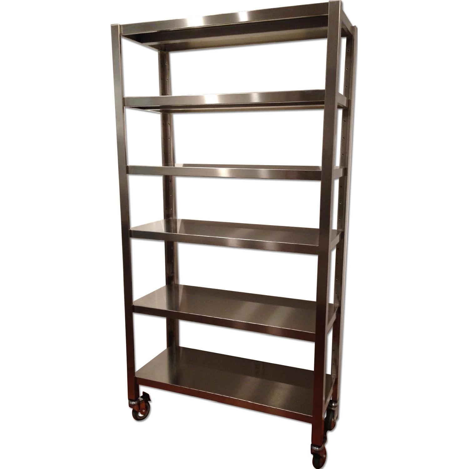 Seller's Notes:Like new stainless steel shelving unit / bookcase with industrial chic look - Design Within Reach purchase - has heavy duty wheels with locking stops for easy moving. five adjustable shelves and two stationary ones make this unit a super organizer for a small space or elegant bookcase for a larger one. measures 75 1/2 tall x 39 wide and 16 deep