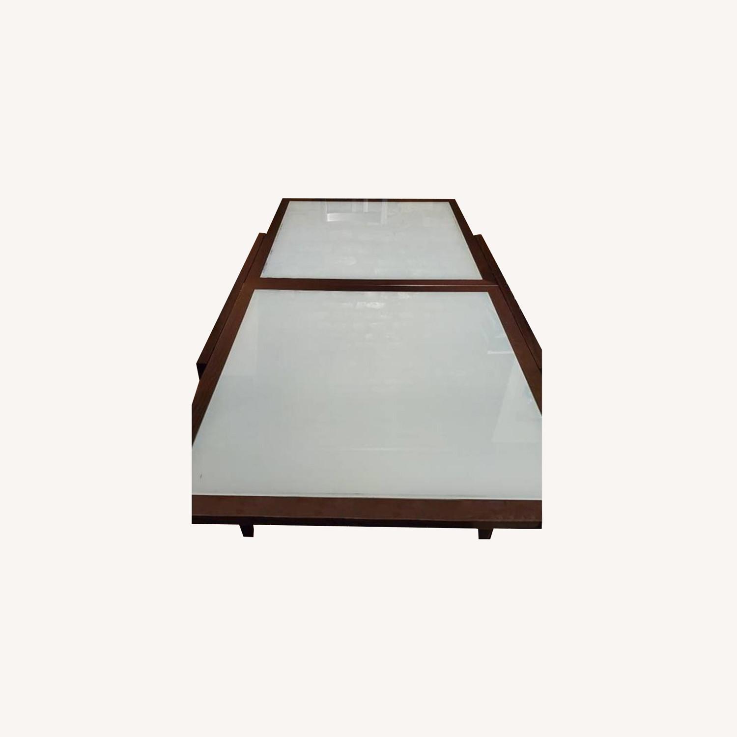 Seller's Notes:This Spanna dining table is perfect for NYC living. Seats four comfortably and easily expands to seat between 6-8 guests. Solid wood construction and frosted glass tops. This DWR exclusive is no longer sold by the company. Made in Italy with solid wood. Happy to include four Ikea chairs with the purchase!