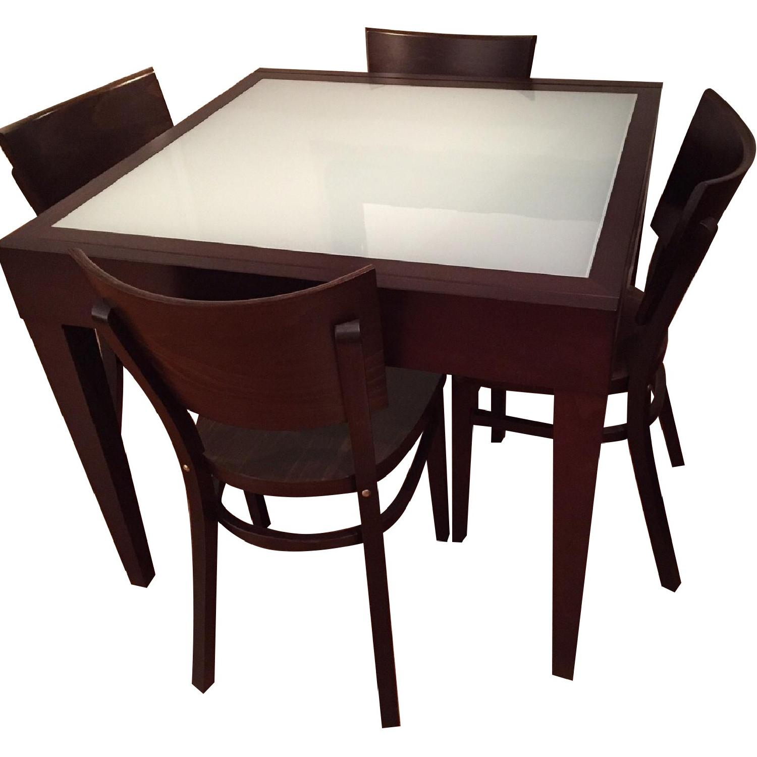 Seller's Notes:DESIGN WITHIN REACH DINING SET - 1 TABLE & 4 CHAIRS TABLE - Beautiful coffee colored wood tables & set of 4 matching chairs from Design Within Reach. Sturdy extension mechanism is easy to use. Two complete and identical table tops, that are either stacked to seat four diners, or side by side to seat six. Made of solid wood and opaque, tempered glass in Italy. 35.5″ W & L 71″ L expanded 30″ H CHAIRS - 4 coffee colored wooden chair that match table