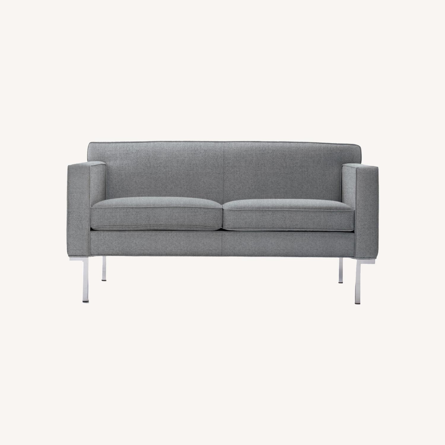 Seller's Notes:100% authentic Design Within Reach Theatre Two Seater Sofa. Upholstery is Lama Tweet in Heather (medium grey) color. This fabric is extremely durable. Perfect condition. No wear or stains. Never exposed to pets, children or smokers. New price from DWR is $3,295. We are moving and the sofa doesn’t !t the new place, so we have to sell. The following is from the DWR website description: A picture of modern comfort — Modern sofas often claim minimalist appeal, but few can also tout the comfort of the Theatre Sofa. Its stream- lined form features a gently angled backrest and elevated armrests to create a comfortable seat. Designed to accommodate the human body with studied proportions and simple geom- etry, the Theatre Sofa’s (2001) comfort stems from its form rather than excessive layers of stuffing. With a gently angled backrest, full seat depth, and elevated armrests, the Theatre Sofa displays Boerner’s signature artisanal details. A gleaming chromed steel base runs the entire depth of the design, and welted seams lend strength and de!nition to the upholstery. Made in U.S.A. - Gently angled backrest and elevated armrests for added comfort. - Welted seams add strength and de!nition to the upholstery. - Stands on a chromed steel base. - Made in U.S.A.
