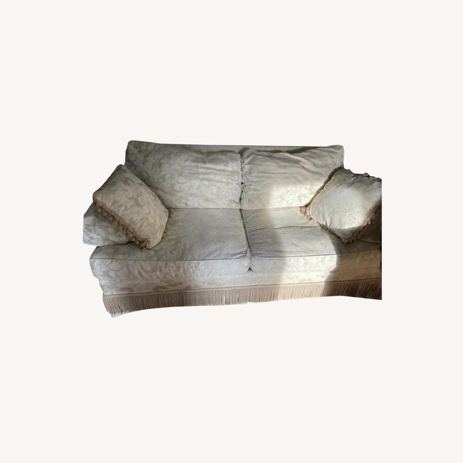 Seller's Notes:This Hickory White couch has insanely soft cushions and a beautiful material that goes with every decor. The added details of tassels surrounding the bottom frame of the couch, along with matching throw pillows make this an elegant addition to any room. This couch can be displayed mid-room without the need to be against a wall because of the beautiful attention to detail when it was made. The only blemish is the one tassel on the left side of the couch was pulled but can be attached by a few stitches...I didn't want to do anything to it on my own We love the couch but need the room to provide a new design of the room for my mother.