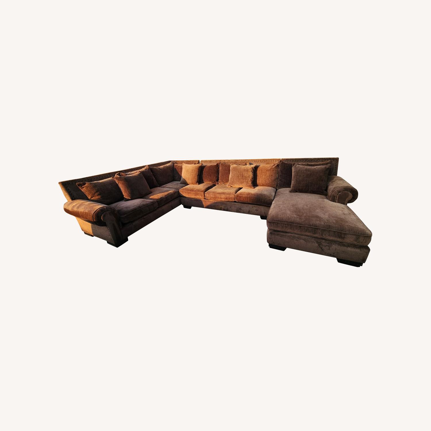 Seller's Notes:Extra large, custom made, high quality, feather-downed sectional. Designer couch by Robert Michael. Thick and durable fabric with a wave like pattern, soho mink. Nailhead trimmed backrest and armrest. 12 plush, extra filled pillows. Large 9 inch designer accent legs. This couch will fill a large room. Thoroughly cleaned. Measures at 102 x 164 x 68. In stands 39" high. Pickup preferred.