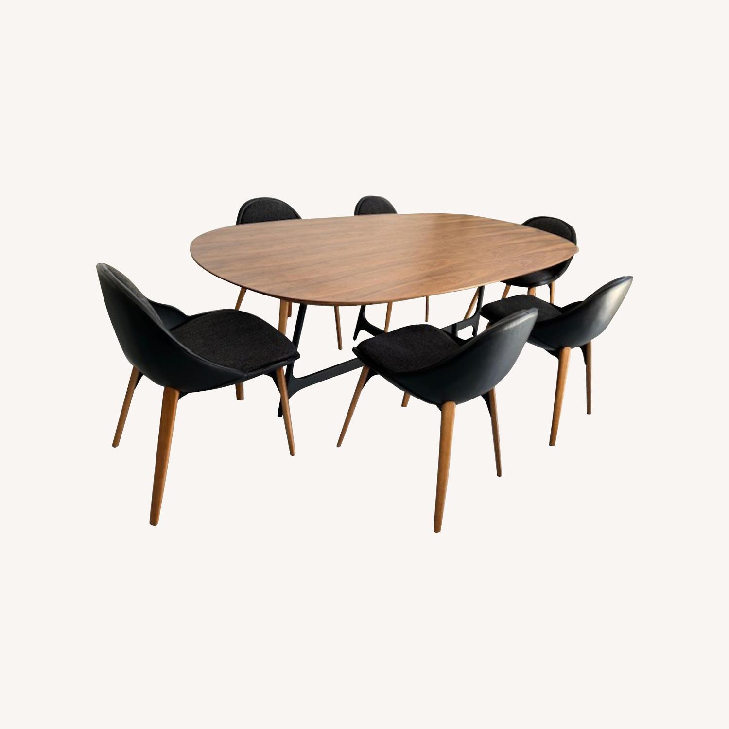 Seller's Notes:Modern contemporary design, unbeatable european quality. This fantastic set includes dark walnut table with reinforced base and six chairs (artificial leather, fabric, wooden legs). This set is brand new. Decided to go with another option.