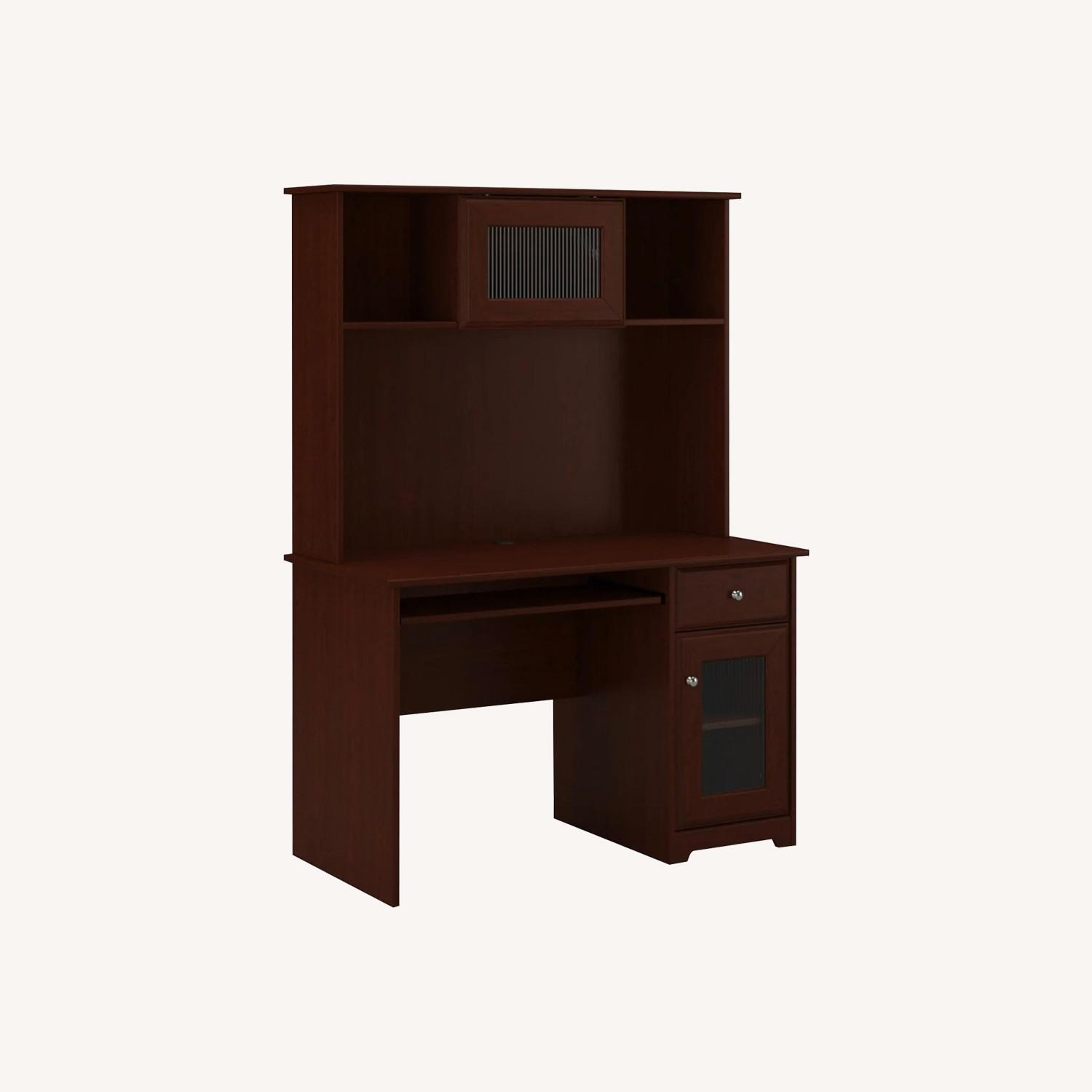 The Bush Furniture Cabot 48W Small Computer Desk with Hutch and Keyboard Tray presents an ideal home office solution for working in compact areas. Set up with your computer and all the materials you need to stay productive on a desktop that supports up to 200 pounds. The work surface also includes a built-in wire management grommet to keep pesky cords and cables out of the way while a pull-out shelf conveniently stores your keyboard or laptop. Stash writing utensils, notepads and other office supplies in the Small Desk's box drawer and organize additional materials inside the lower storage cabinet. The Desk Hutch adds a center cabinet with a stylish fluted glass door in between two open compartments for flexible storage and display. Find the perfect look to complement your tastes with attractive Espresso Oak, Harvest Cherry, Linen White Oak and Modern Gray finish options. The Cabot Collection also includes a Lateral Filing Cabinet, Tall 5 Shelf Bookcase and 6 Cube Organizer for additional storage as well as a Mid Back Tufted Office Chair and Mid Back Leather Box Chair to complete your workspace with the same elegant style (coordinating items sold separately). This home office desk with storage has been tested to meet ANSI/SOHO quality standards for safety and performance and is backed by the Bush Furniture 1 Year Manufacturer's Warranty.