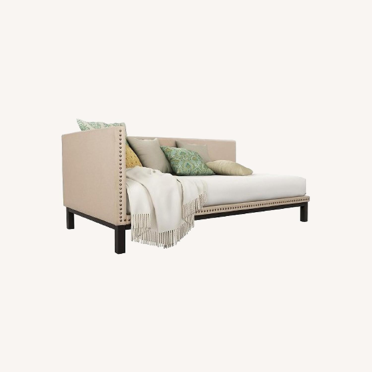 Seller's Notes:Simple and sophisticated, the Mid-Century Upholstered Daybed from DHP brings the late 18th-century classic style to life. With a silhouette, soft linen fabric and nailhead trim, the twin daybed This Daybed didn't come with a cushion; buyer must provide. Daybed can be taken apart for easy transport. Color is Pinkish-Tan Note: This is a Left-arm Daybed Built with a sturdy metal frame, this versatile twin-size daybed offers extra seating and sleeps one comfortably. A perfect fit for any bedroom, living room or guest room, the DHP Mid-Century Upholstered Daybed is grand in both scale and beauty.