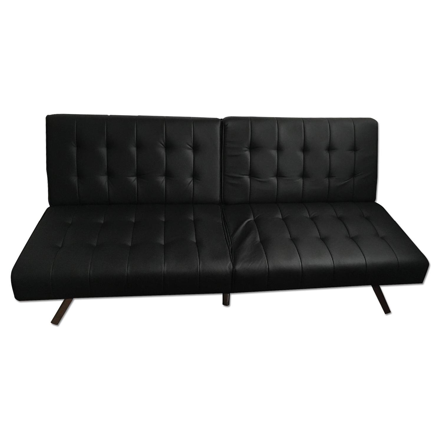 Seller's Notes:Moving back to the west coast and can't take my futon with me DHP's Emily Splitback Futon Sofa Sleeper, tufted faux leather, pull-down sofa couch - Measures when folded up: 32" High, 71" Wide, 34" Deep / Seat Height is 16" High and 23" Deep - Split-back to suit your needs. Converts from chaise to sleeper (easily converts from sitting to lounging and sleeping) - Modern look and design with chrome metal legs - Tufted black faux leather - Easy Care, wipes clean
