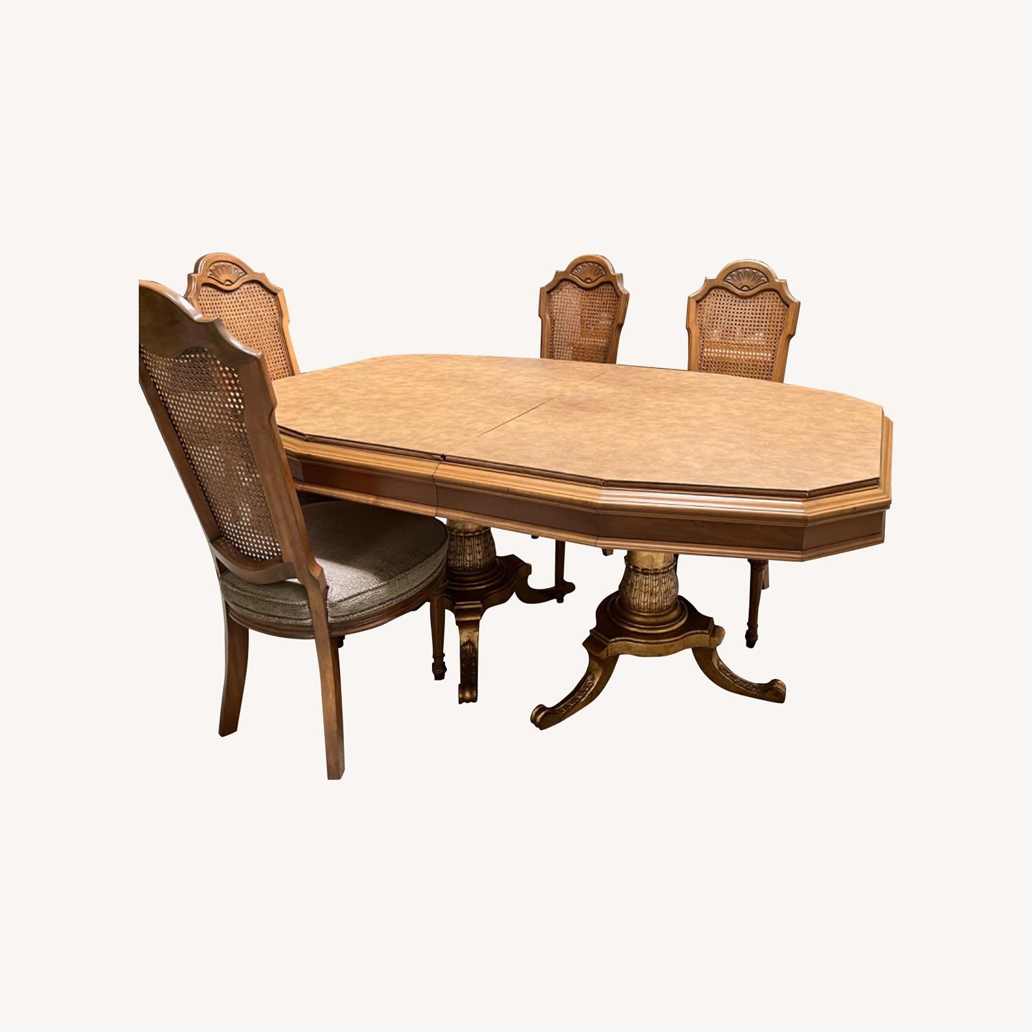 Seller's Notes:Dining Room table 4 chsirs 2 captains chair 2 leaves seats 12 fully expanded plus table protector pads Gold leaf pedastals