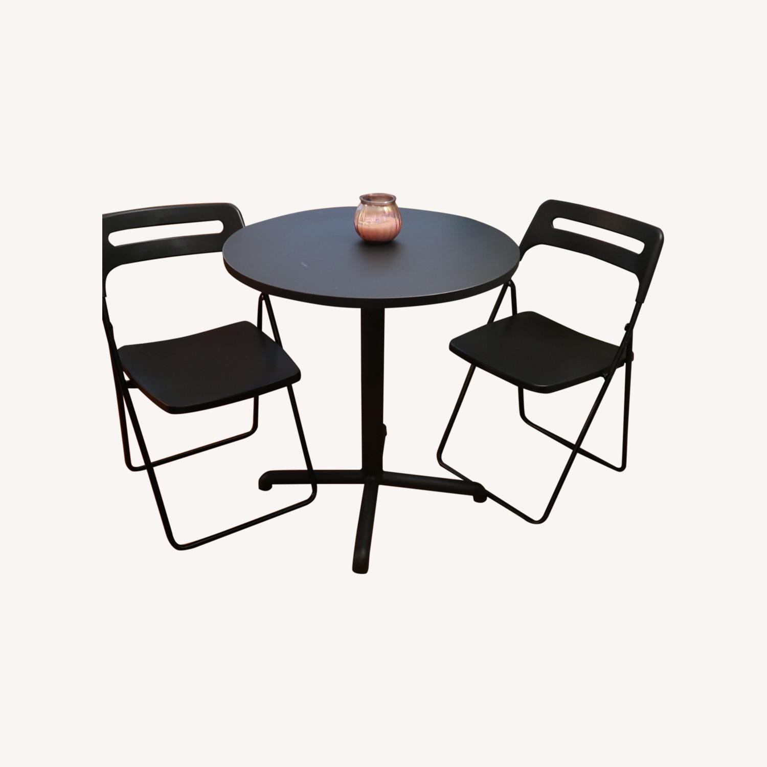 Seller's Notes:Dining for 2! Almost brand new dining set from IKEA. 2 Black Nisse Folding Chairs - Height 29 7/8" - Width 17 3/4" - Depth 18 1/2" - Seat Height 17 3/4" Stensele Table, under table hooks for bags - Height 29 1/2" - Diameter 27 3/8"