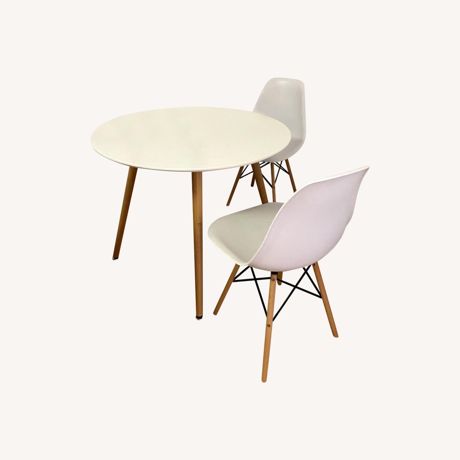 Seller's Notes:-------Track Circular Dining Table------- - Solid Beechwood Legs - Fiberboard Top - Round Dining Table - Plastic non-marking foot caps Overall Product Dimensions: 35.5"L x 35.5"W x 29"H - Table Top Thickness: .5"H - Leg Size: 1.5"W x 28.5"H -------Two Chairs------- Wood Pyramid Side Chair Color: White 32.5 H x 18.5 W x 21 L